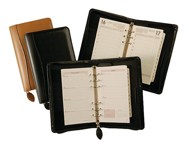 Features : Zippered Daily Organizer available in Black or Tan Bonded Leather. 6 Ring Binder with multiple credit card/business card slots, pen loop, interior pocket and zippered closure. The organizer comes complete with : Week-to-a-Spread Format, Valuable Information Pages, To Do Pages, Address Pages, Monthly Tabbed Indexes, A-Z Indexes and Page Marker.